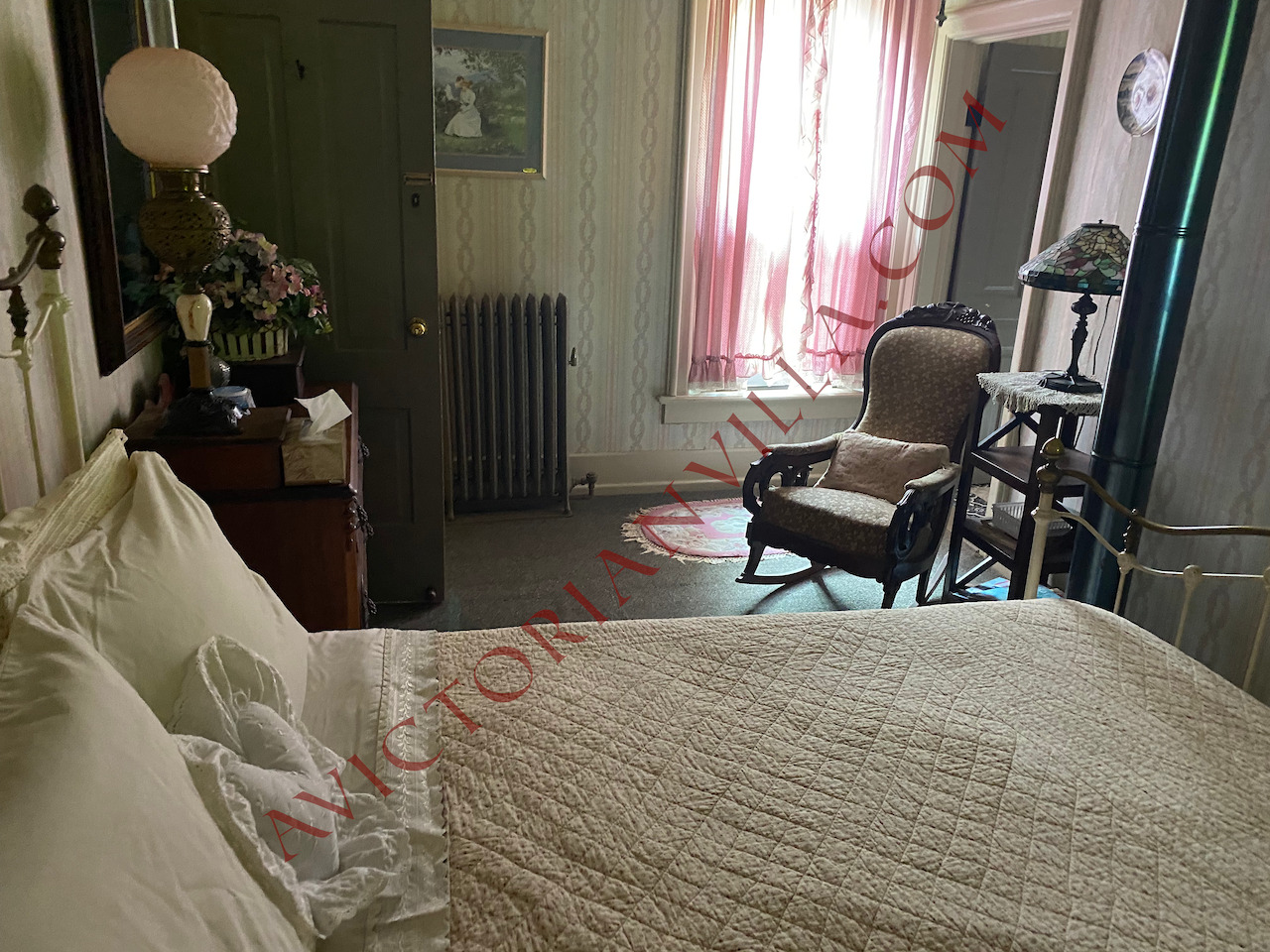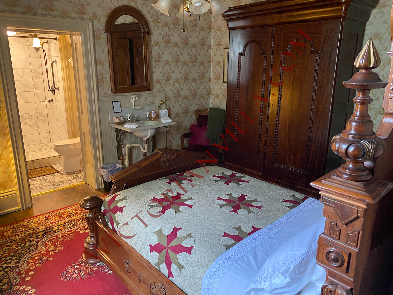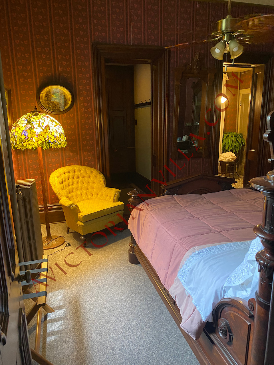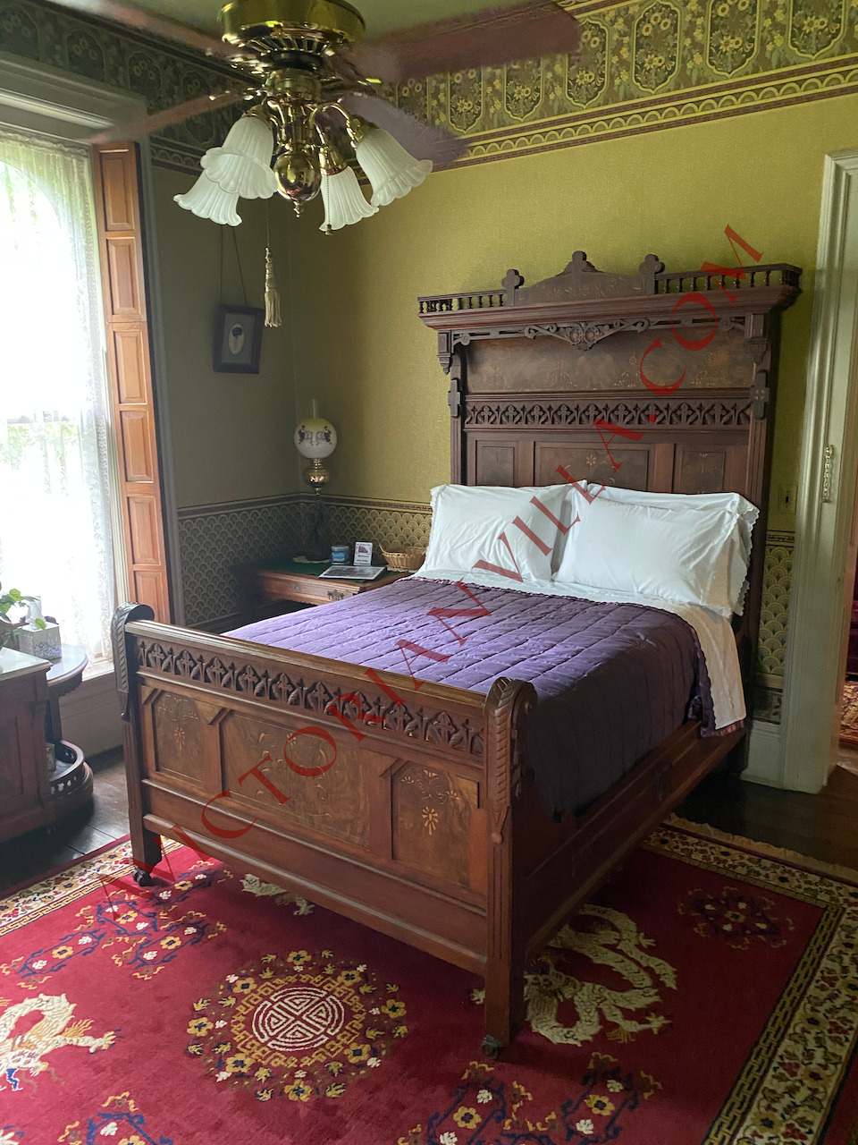 Opulent second floor 1880's "Eastlake" bed chamber set; ornate decor and shuttered windows with a private non-adjoining (down-the-hall) antique clawfoot soaking tub(non-shower) bath. Air conditioned in summer and literally the coolest room in the winter.