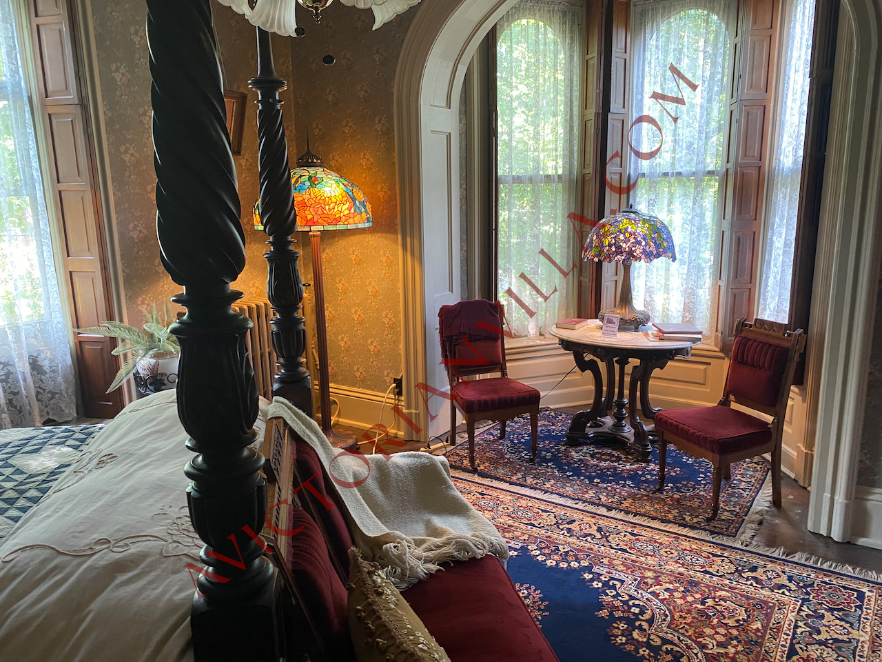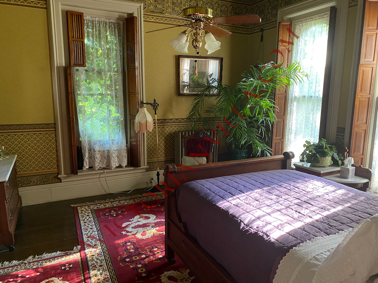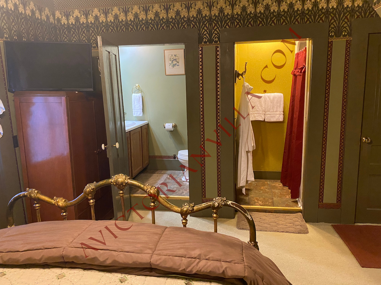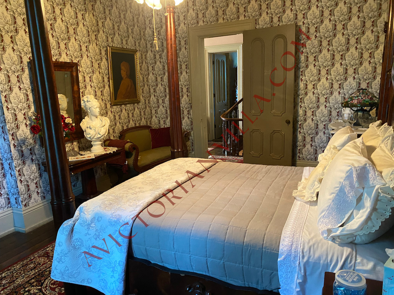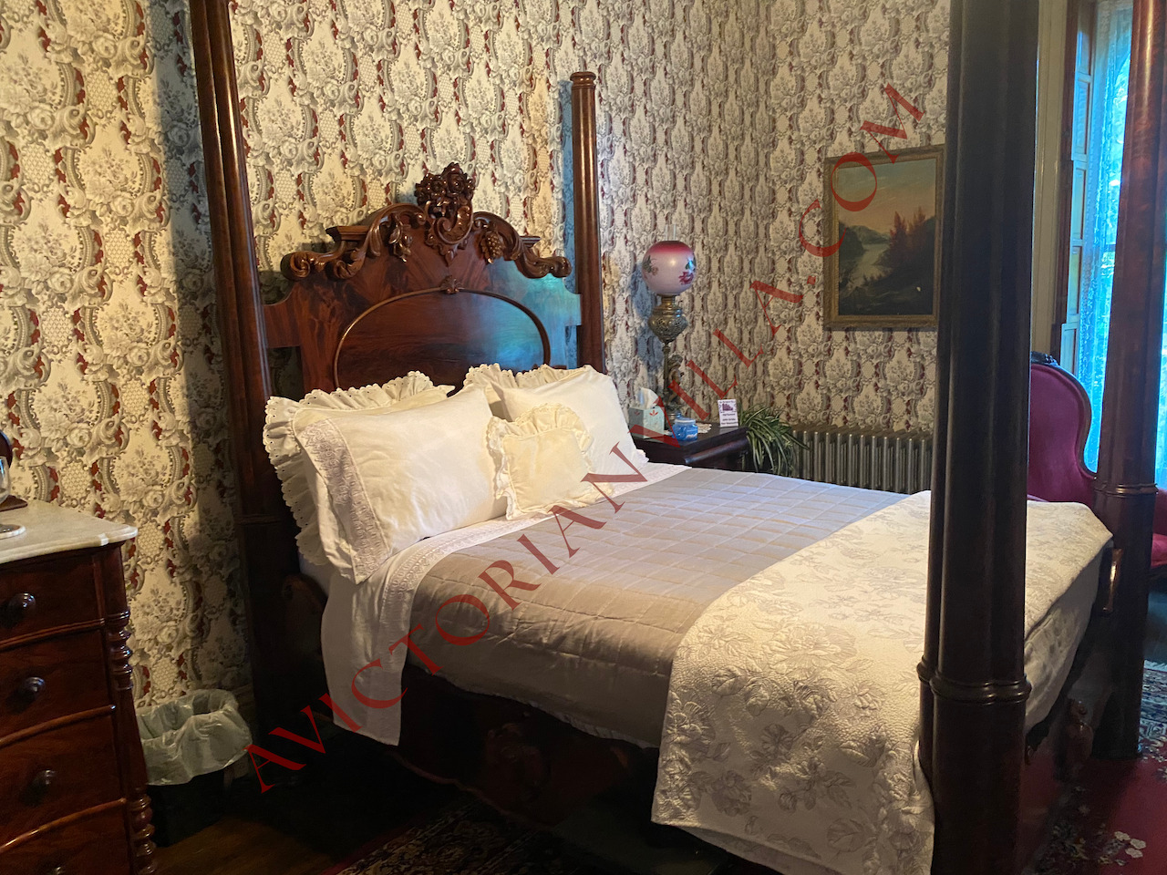 Opulent second floor 1880's "Eastlake" bed chamber set; ornate decor and shuttered windows with a private non-adjoining (down-the-hall) antique clawfoot soaking tub(non-shower) bath. Air conditioned in summer and literally the coolest room in the winter.