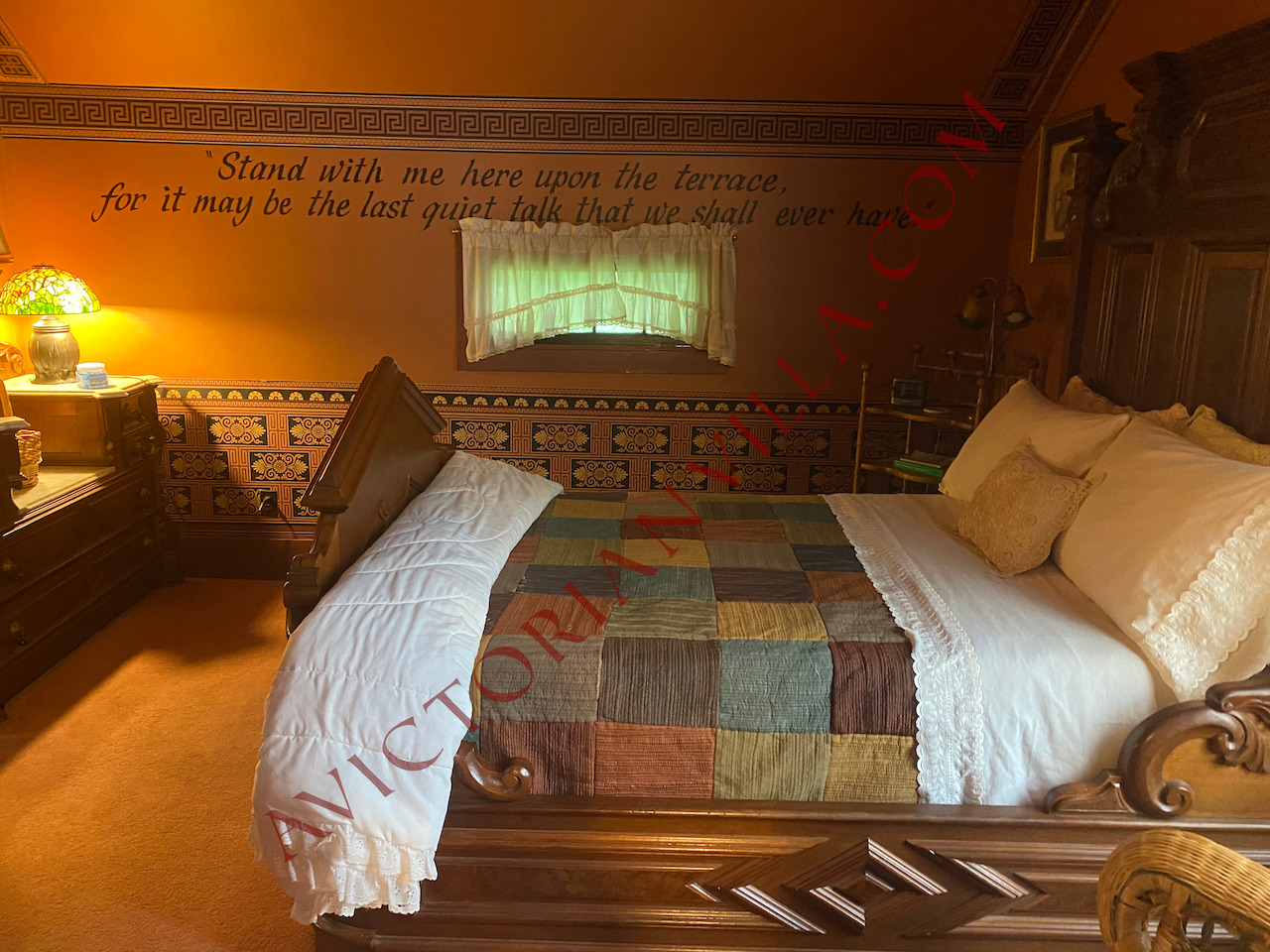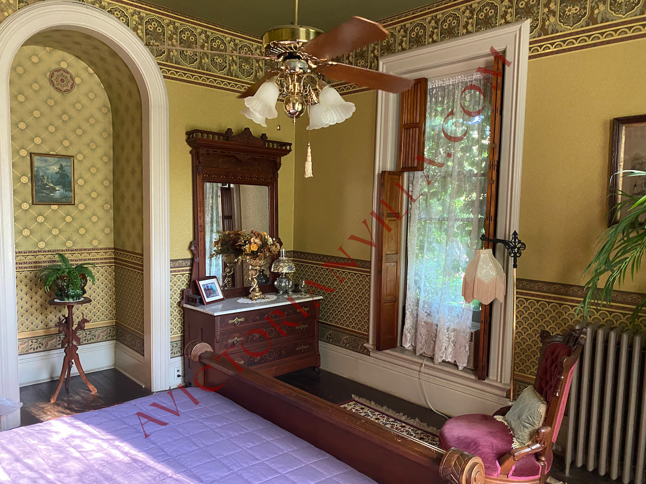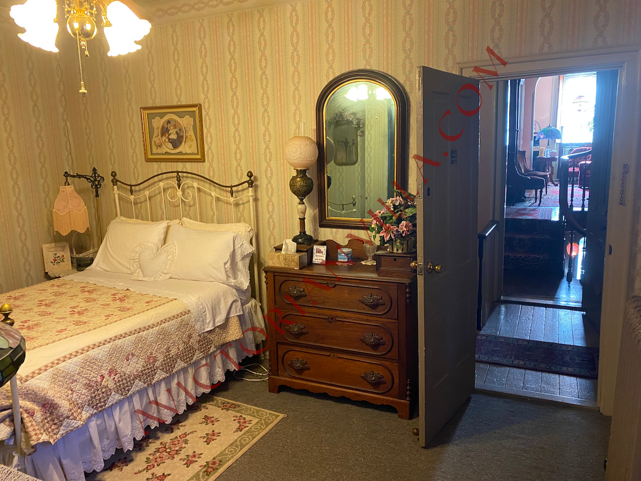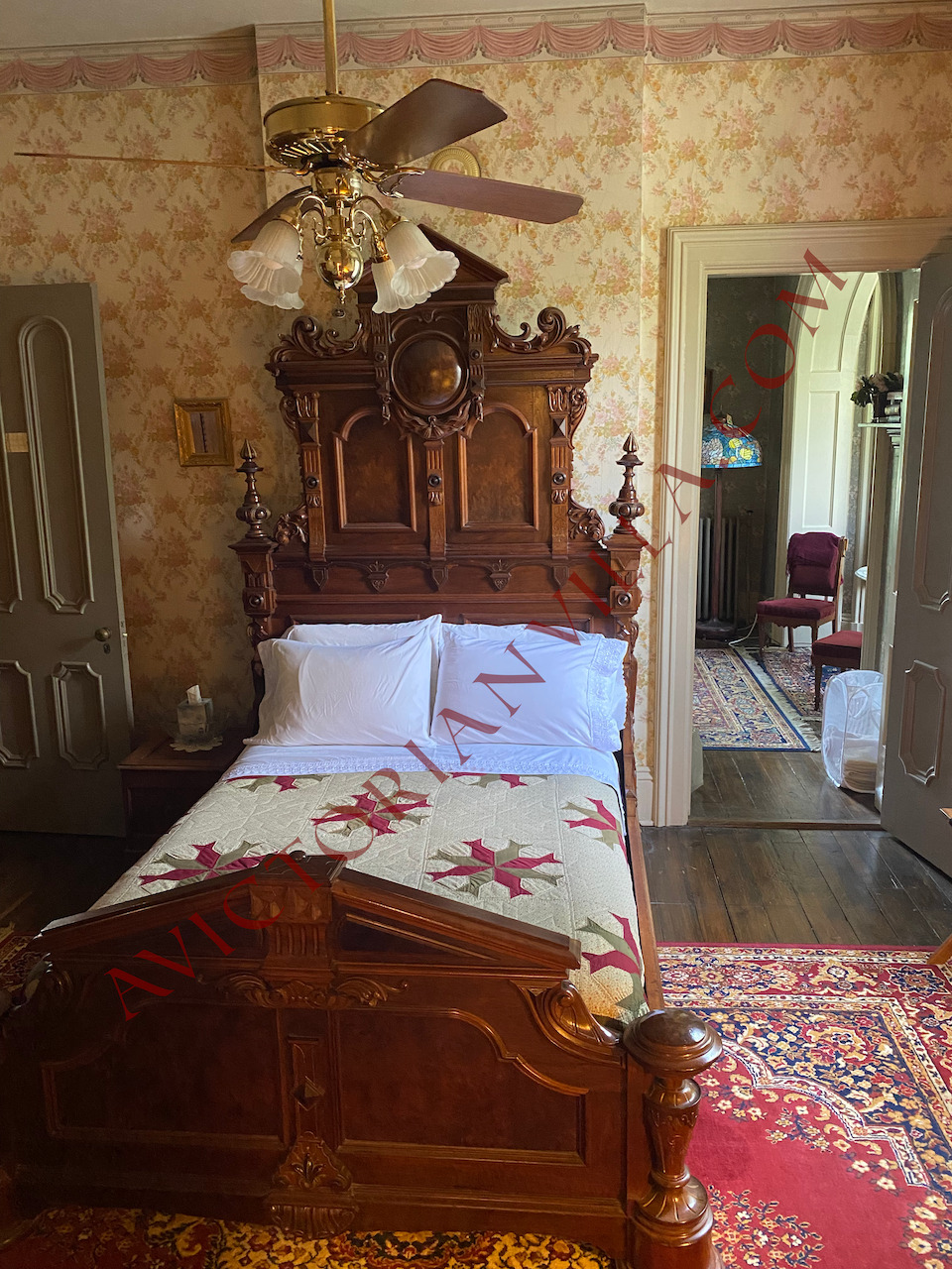 Opulent second floor 1880's "Eastlake" bed chamber set; ornate decor and shuttered windows with a private non-adjoining (down-the-hall) antique clawfoot soaking tub(non-shower) bath. Air conditioned in summer and literally the coolest room in the winter.