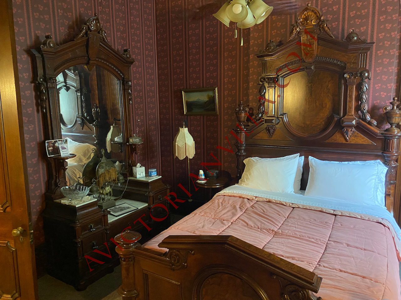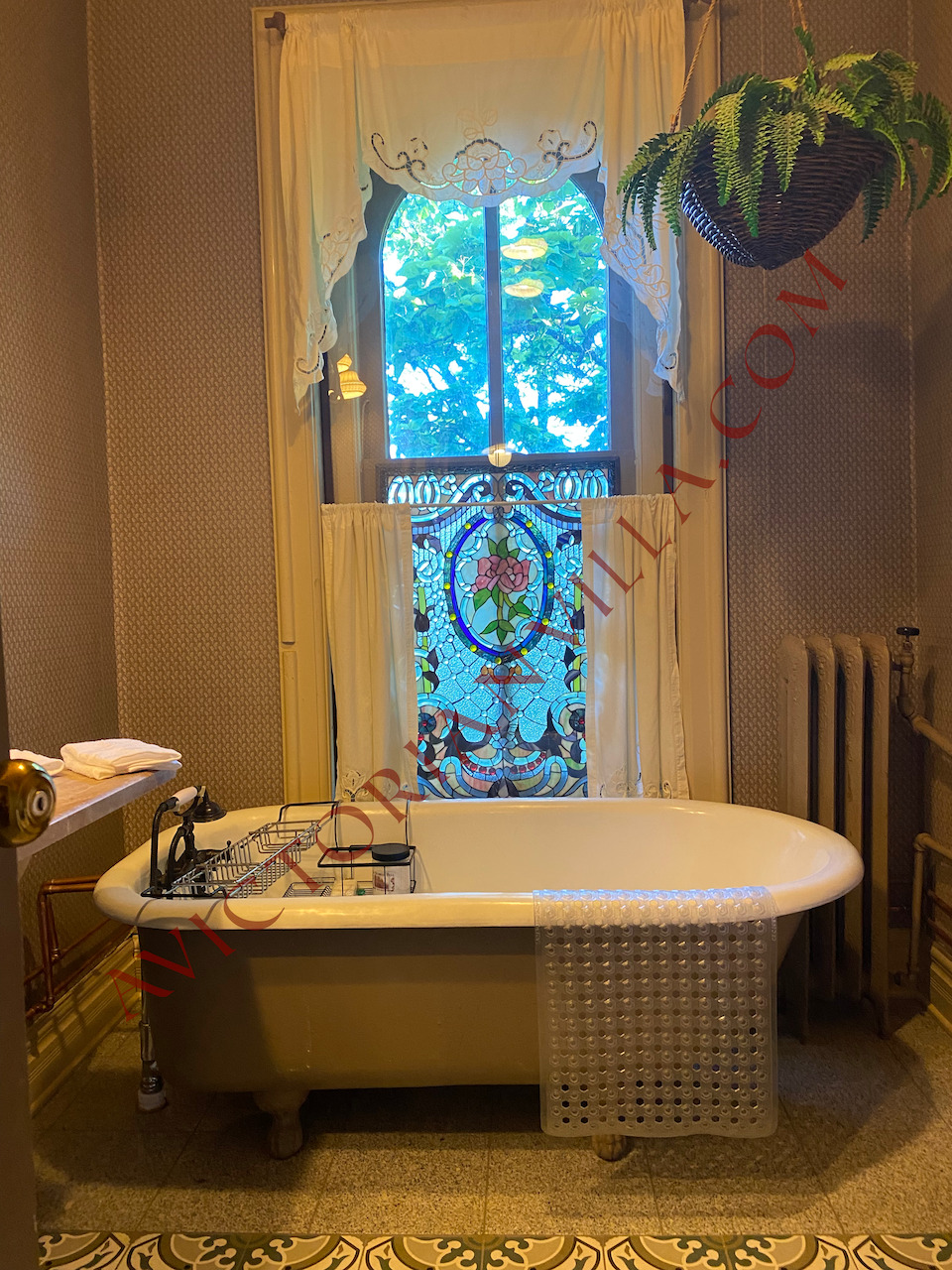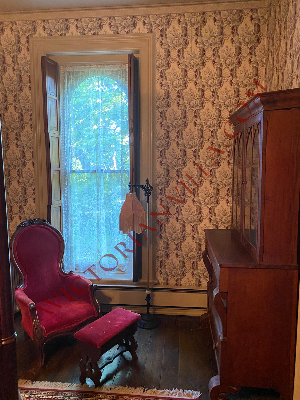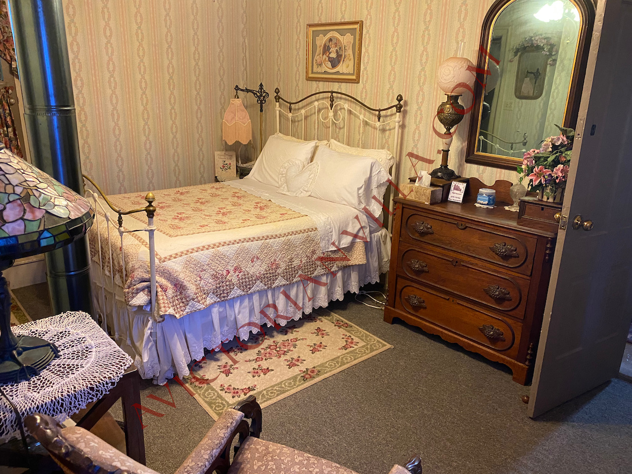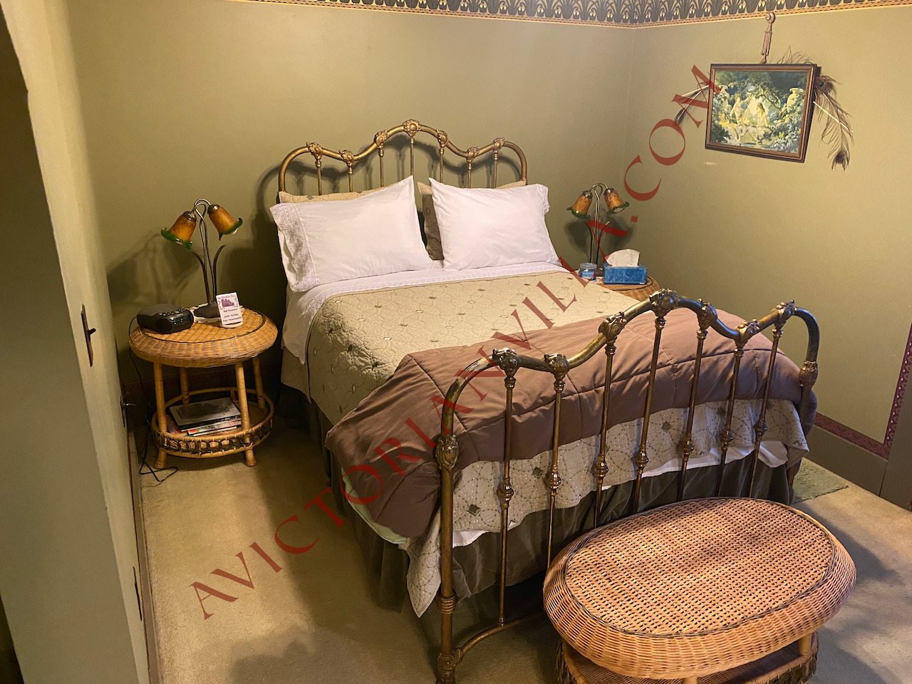 Opulent second floor 1880's "Eastlake" bed chamber set; ornate decor and shuttered windows with a private non-adjoining (down-the-hall) antique clawfoot soaking tub(non-shower) bath. Air conditioned in summer and literally the coolest room in the winter.