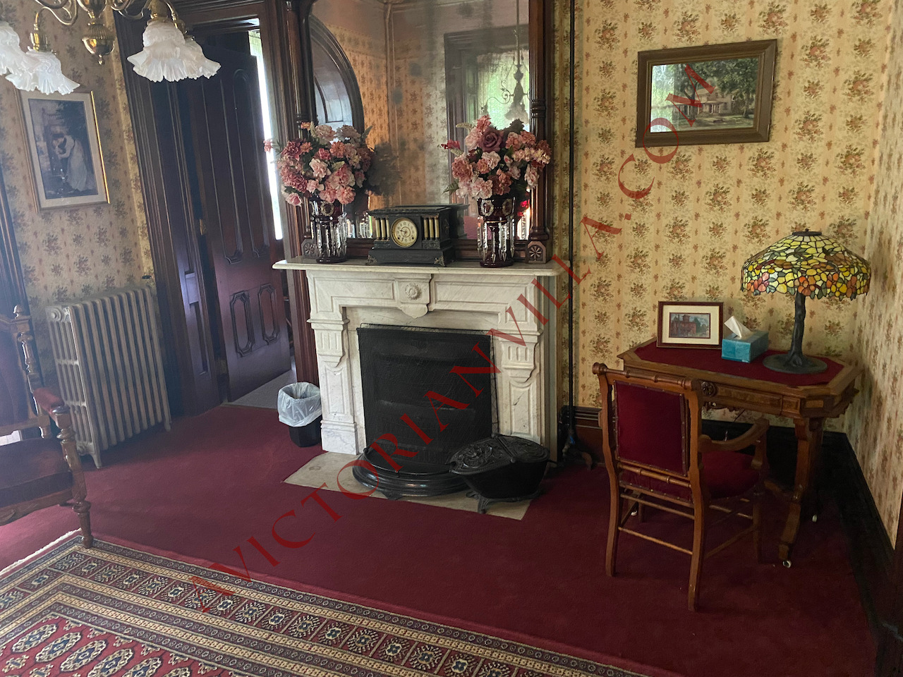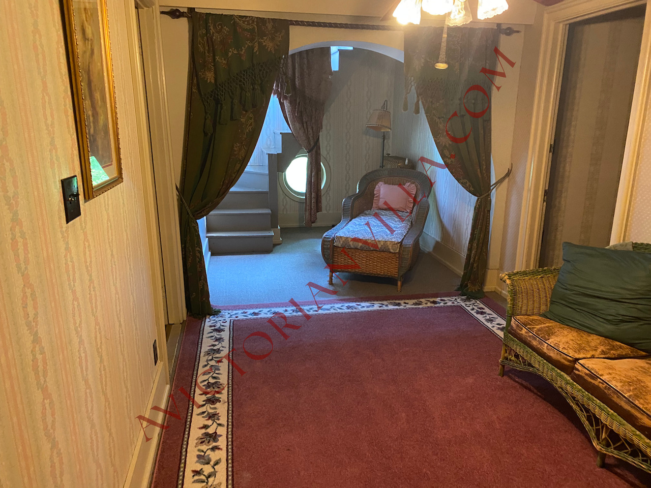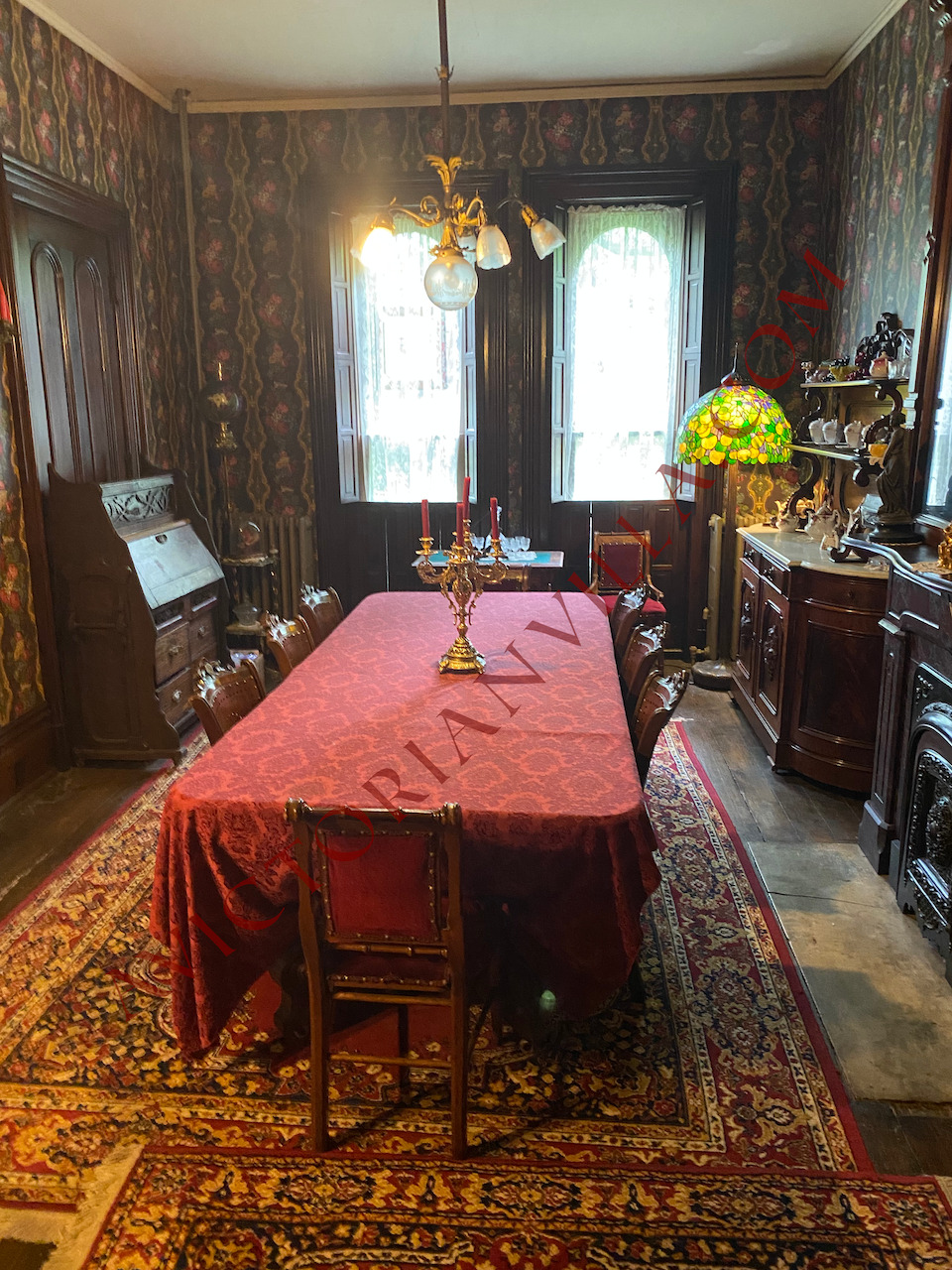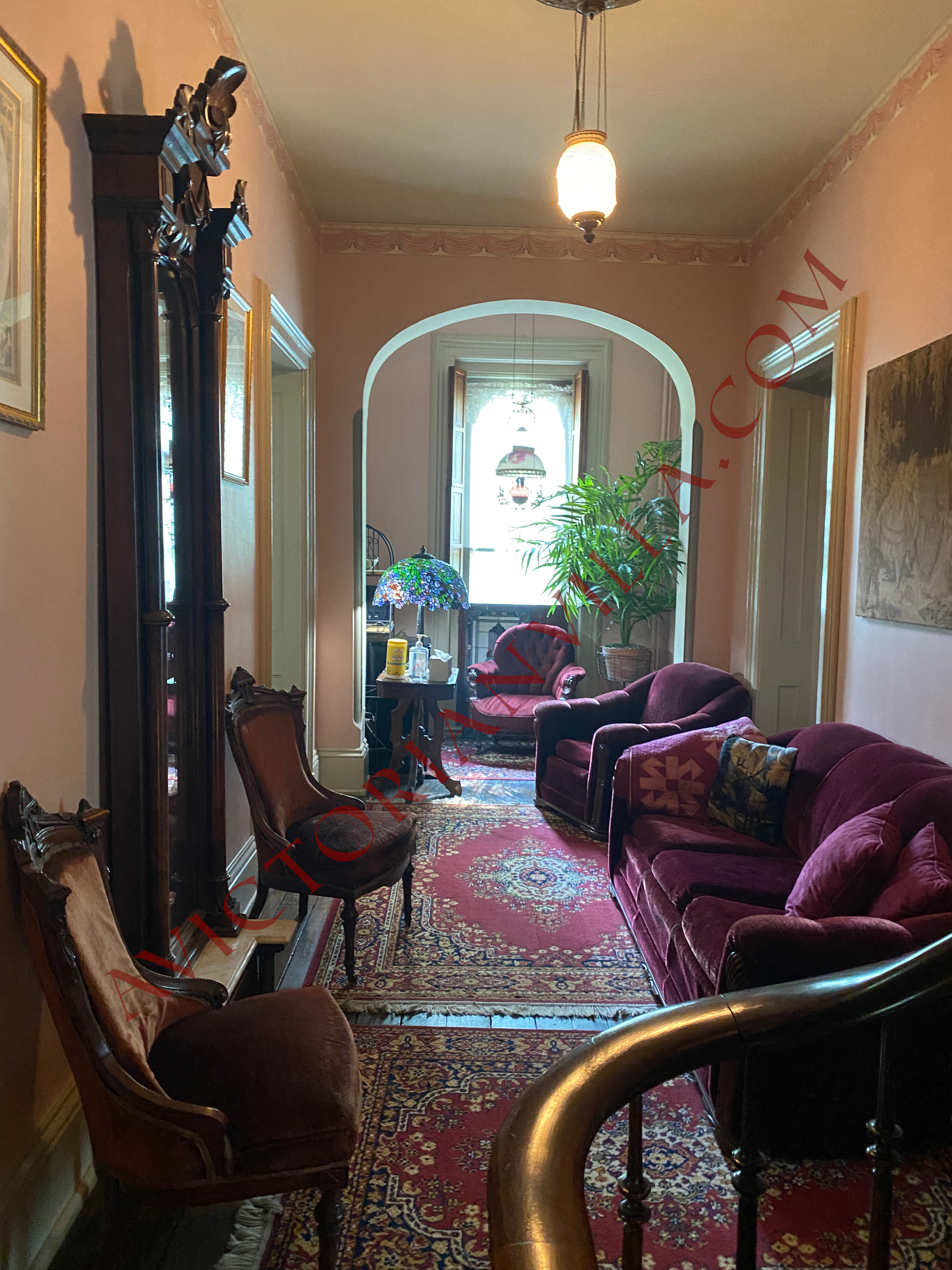 Opulent second floor 1880's "Eastlake" bed chamber set; ornate decor and shuttered windows with a private non-adjoining (down-the-hall) antique clawfoot soaking tub(non-shower) bath. Air conditioned in summer and literally the coolest room in the winter.