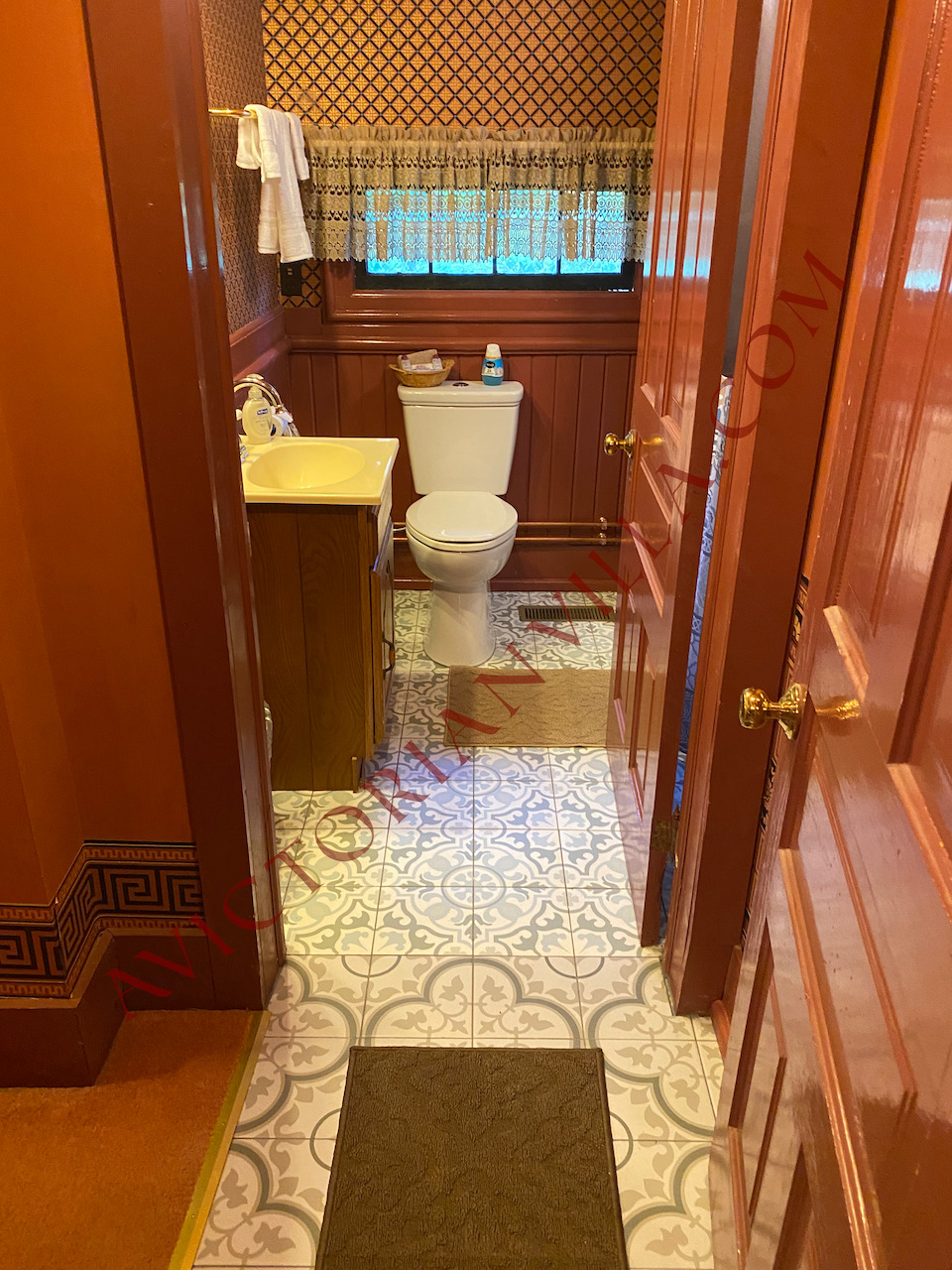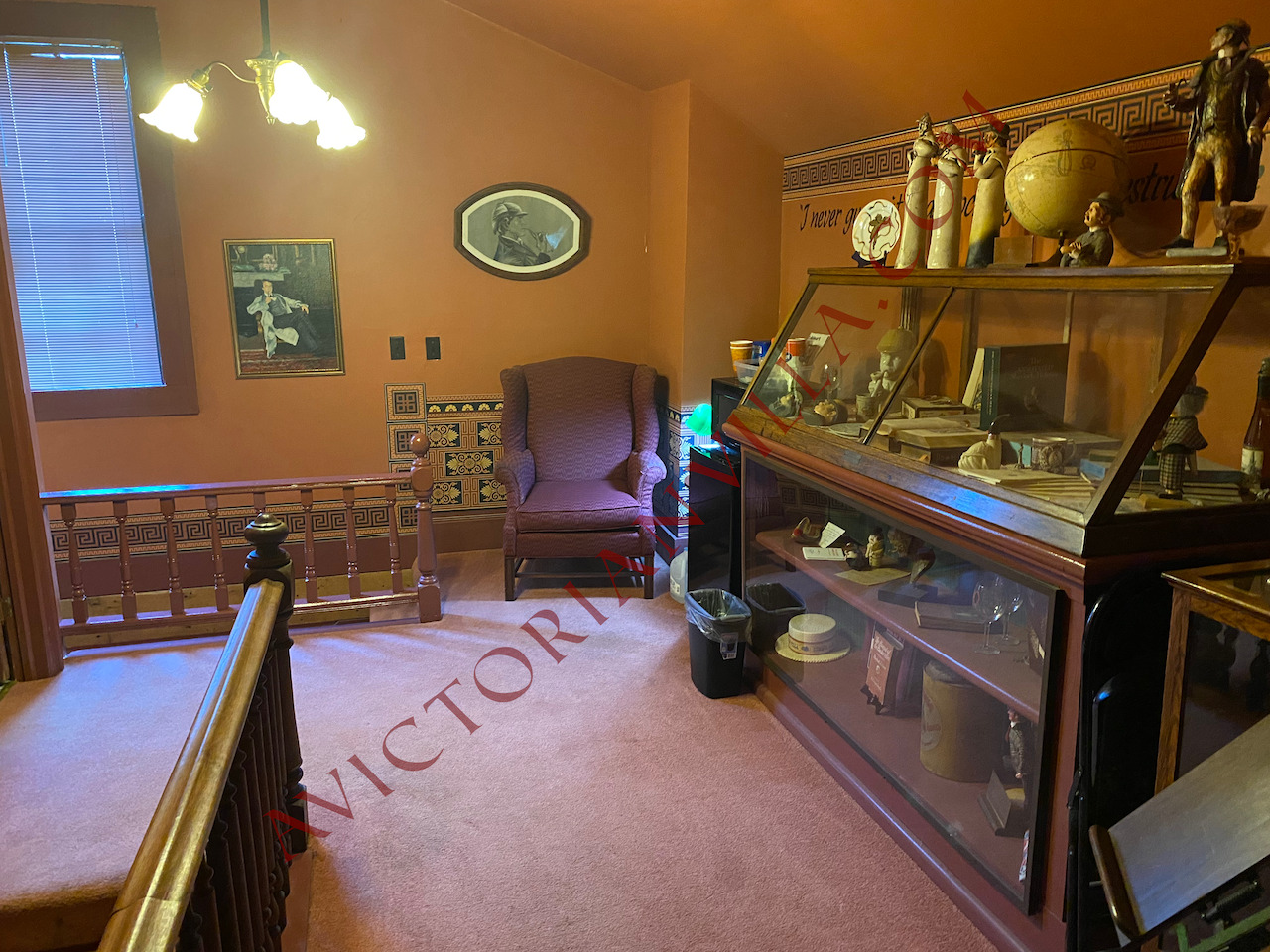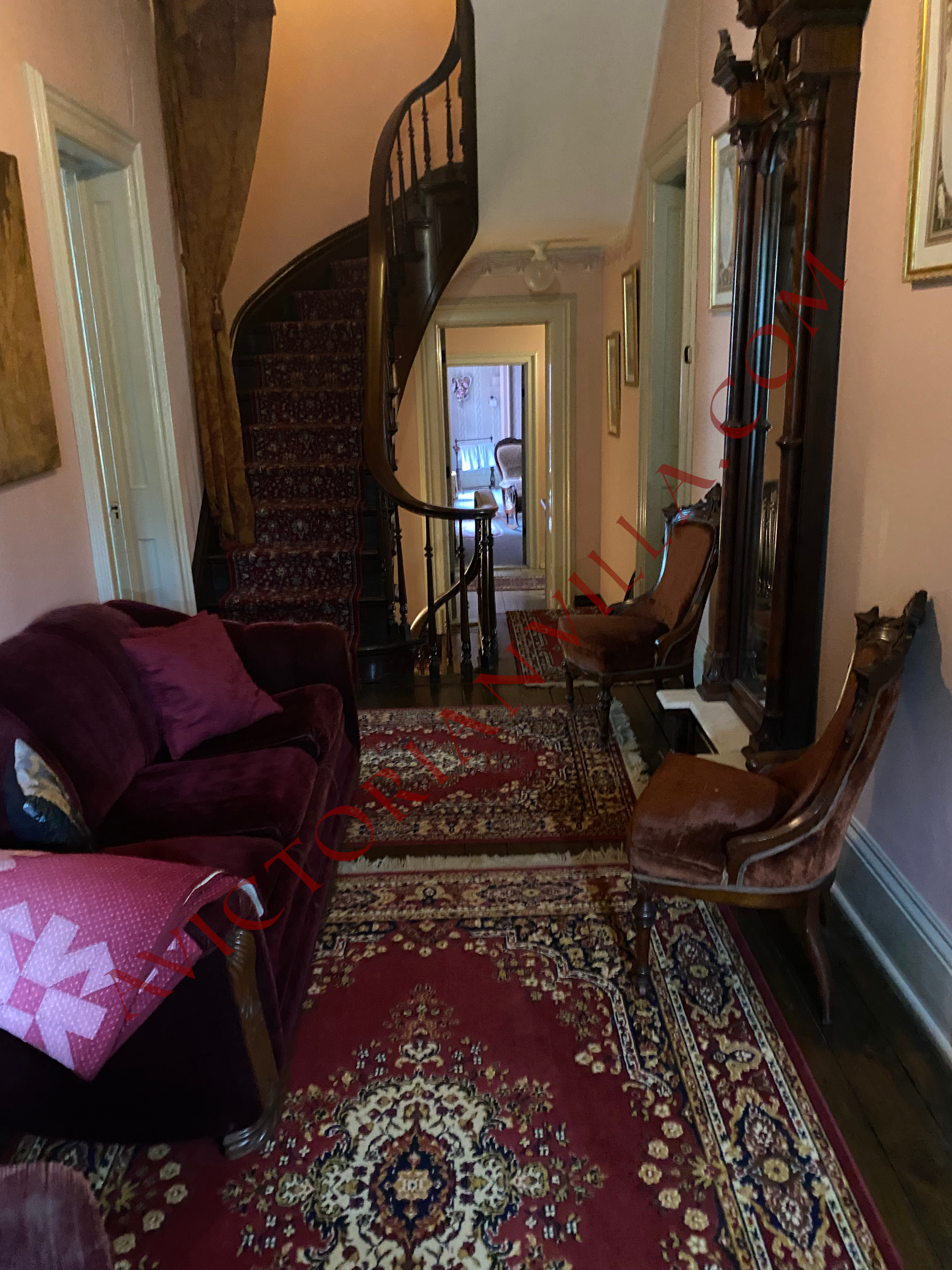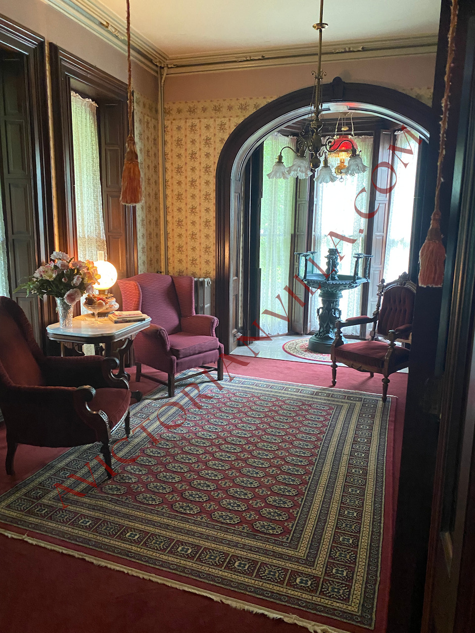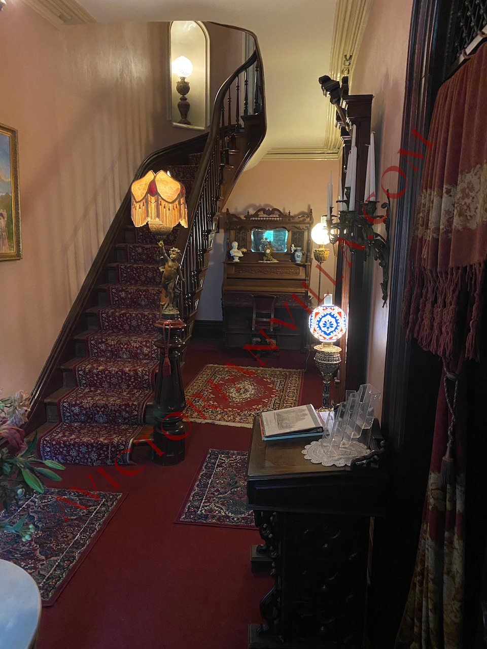 Opulent second floor 1880's "Eastlake" bed chamber set; ornate decor and shuttered windows with a private non-adjoining (down-the-hall) antique clawfoot soaking tub(non-shower) bath. Air conditioned in summer and literally the coolest room in the winter.