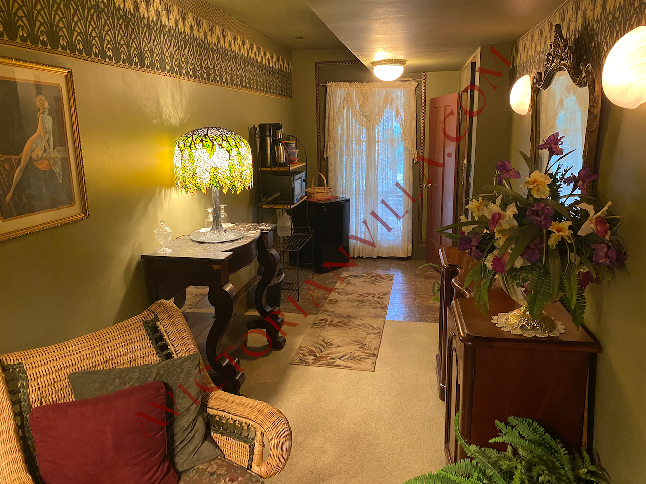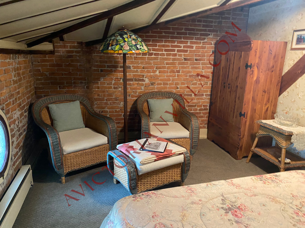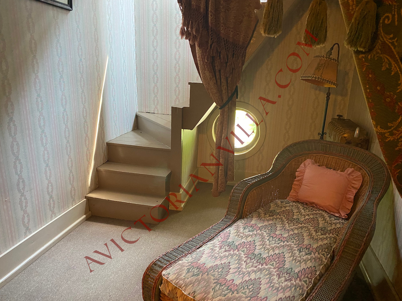 Enchanting, third floor one-room suite with romantic Victorian furnishings and total seclusion. Private modern tub-shower bath; Air Conditioning and Tower Access.