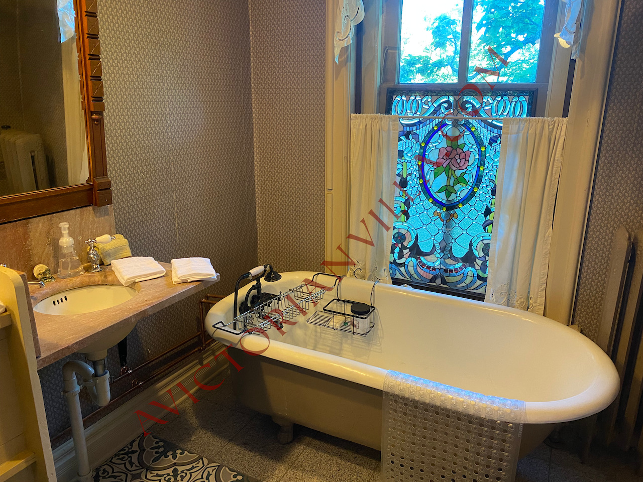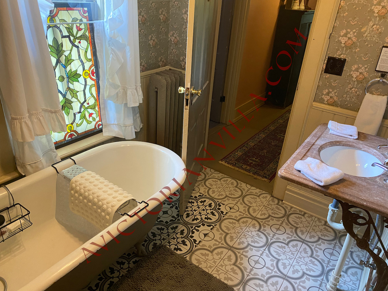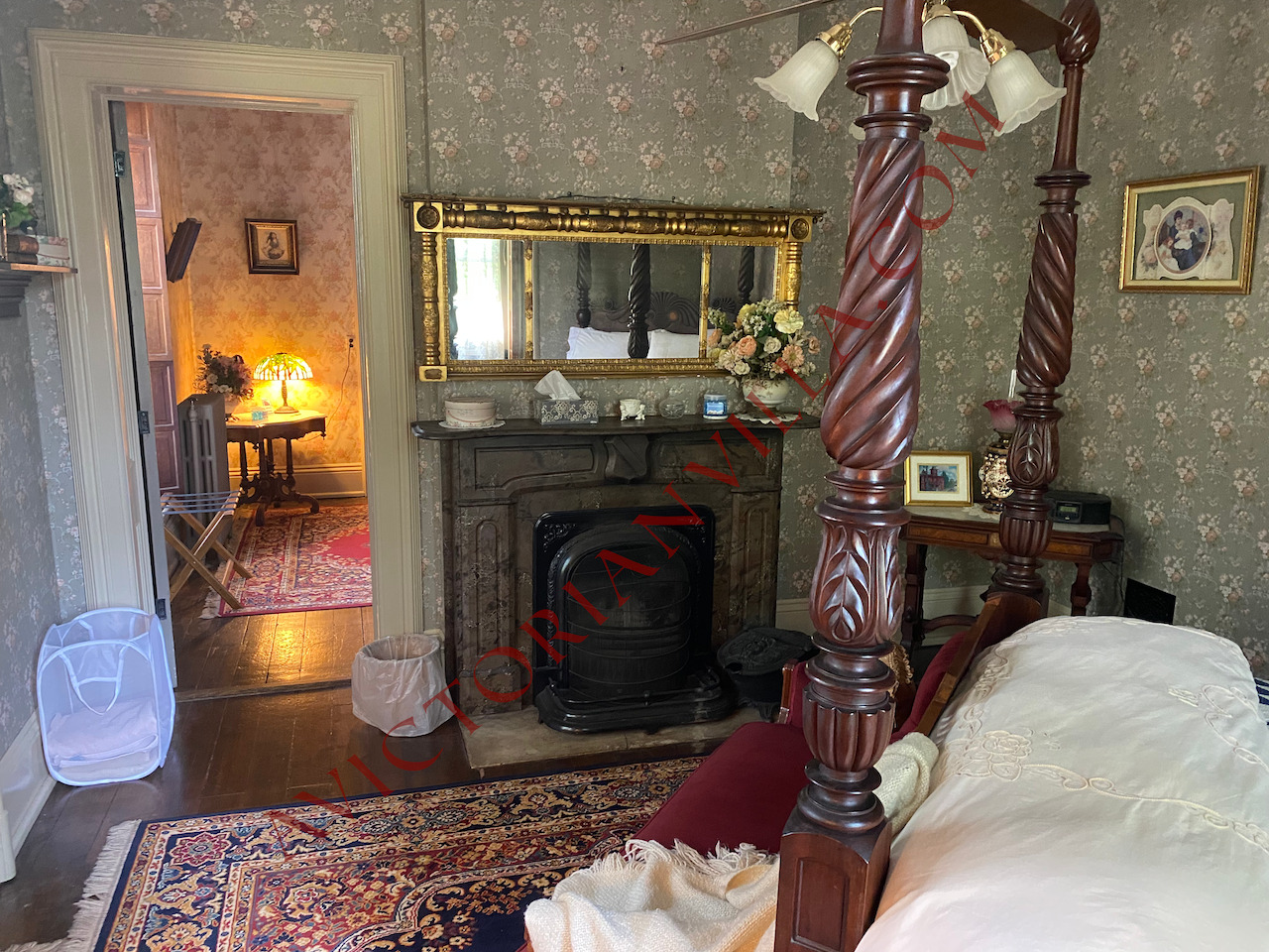 Ornate first floor 1870's two room suite with Thomas Brooks' queen-size bed; gas marble fire place; private Antique Victorian Claw-footed Soaking Tub w hand-held shower bath and Air Conditioning.