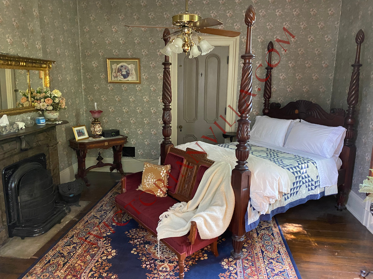 Stately second floor 1850's bed chamber with a massive carved four poster McCracken Queen-Sized Bed; Ceiling Fan; Air Conditioning; Private Non-Adjoining (down-the-hall) Clawfoot Victorian Soaking Tub (non-shower) bath.