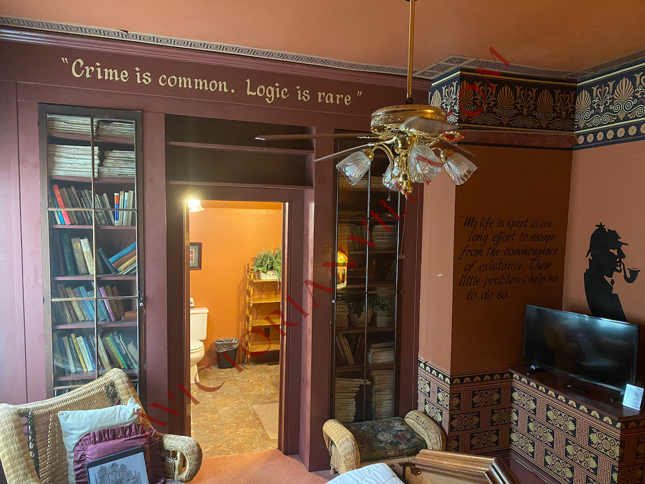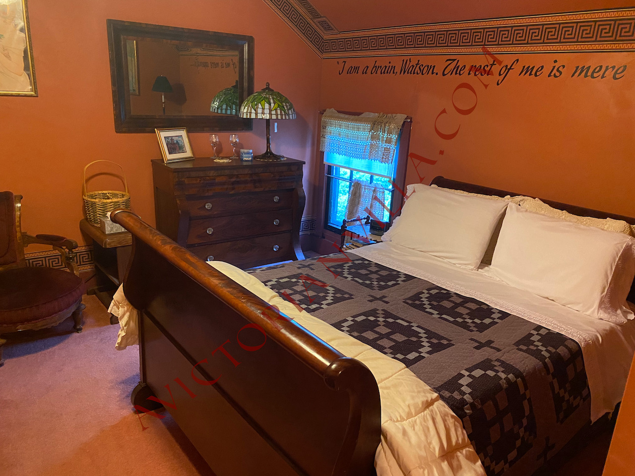 Secluded Sherlockian, second floor 1890's bedchamber with private Mini-Library and elaborate Bedchamber Suite. Private modern shower and bath; Holmes Memorabilia, and Air Conditioning - one of our more popular bed-chambers.
